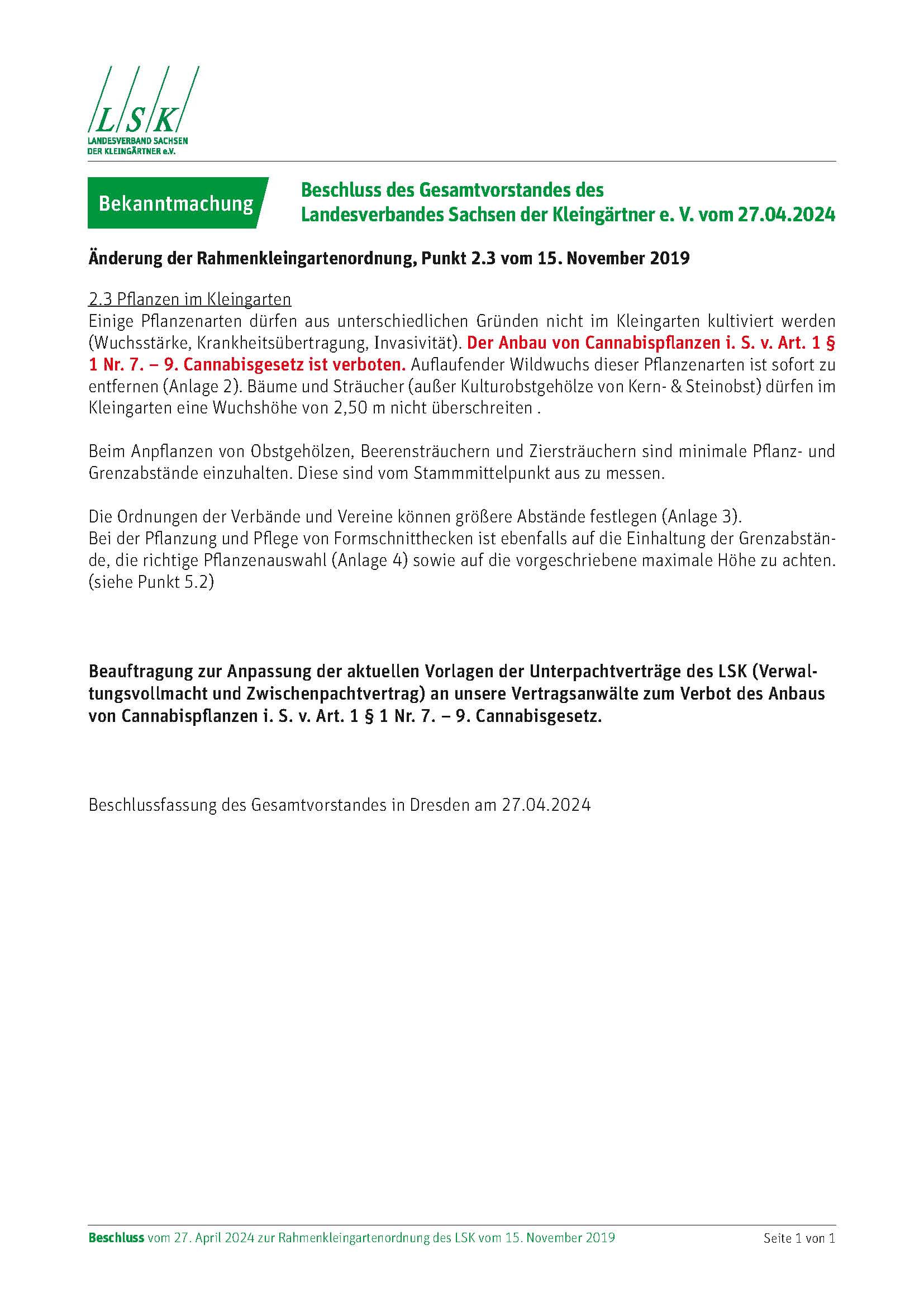 Beschluss des Gesamtvorstandes des Landesverbandes Sachsen der Kleingärtner e.V. vom 27.04.2024 zum Anbau von Cannabispflanzen im Kleingarten